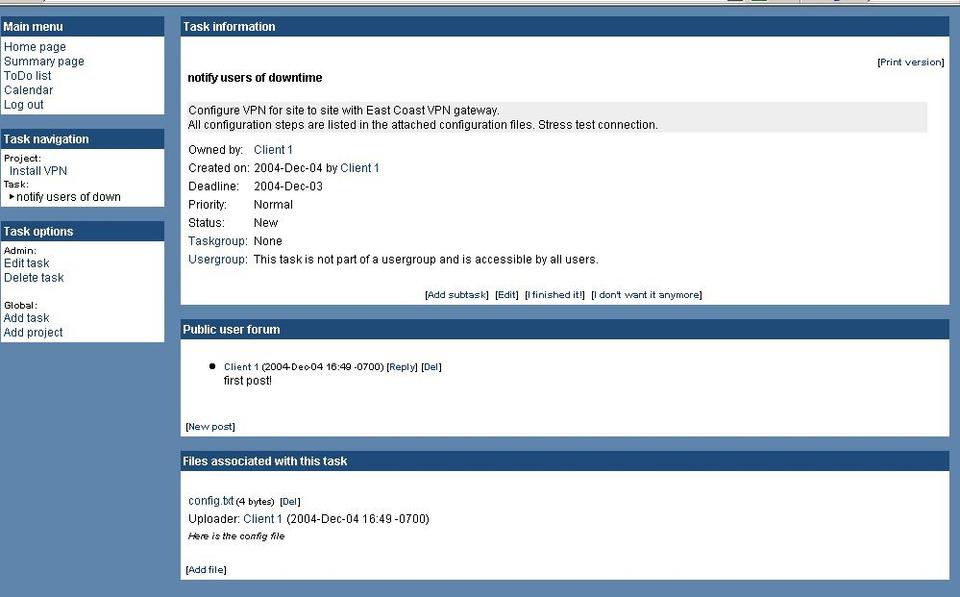 The project and task views are where the software really shines. As mentioned before, each has its own file upload section and message board. This is where the collaborative aspects of WebCollab really set it apart from a traditional to-do list. Users can ask each other questions, make comments, upload relevant documents and much more. This is what separate WebCollab from task management applications and makes it more of a project-oriented groupware. I find the message board element of WebCollab to make things more interactive and thus more interesting for everyone involved.