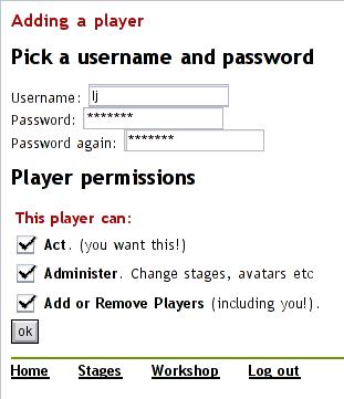 The name of UpStage's default theater director is z, and z has no password. You probably want to change this, so log in and enter the theater's director. Using the Add a new player link, go to http://localhost:8081/admin/new/player and add the name and password of the new director. To make him or her the big boss who can hire and fire, make sure you tick the permission to Add or Remove Players (Figure 2).