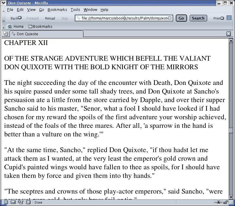 Pyrite can be enough if all you want to do is quickly index a digital library. On the other hand, it is almost trivial to reformat the result to make it more readable in a browser. The snippet of Perl code in Listing 1, albeit ugly, was all it took to produce the version of Don Quixote shown in Figure 1.