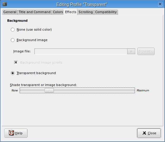 Use the slider to adjust the level of transparency and then close the profile dialog. Now, start the GNOME terminal like this: