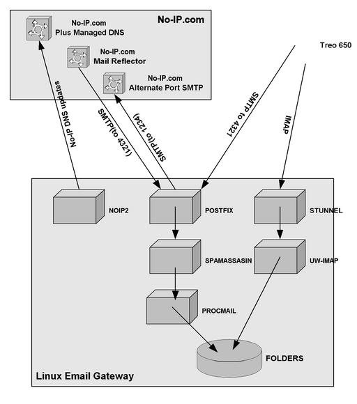 As you can see from Figure 1, there are three main areas of configuration: Linux server, No-IP.com services and the Treo 650 mail client.
