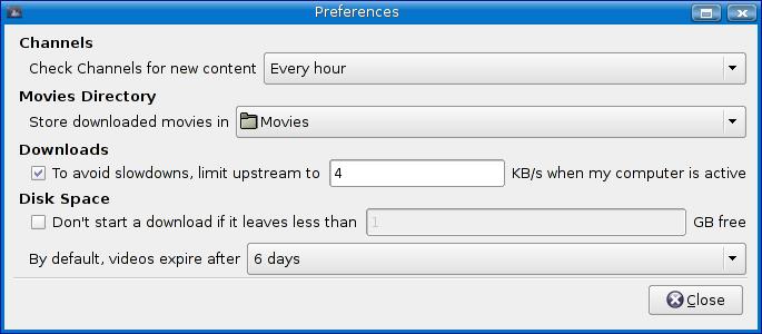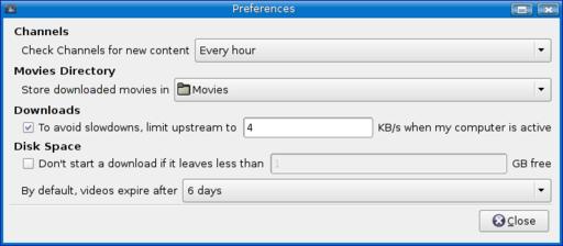 Democracy regularly checks your subscription list to check for new content. If you want, you can override the one-hour interval using the combo box at the top. What I really want to highlight, however, is the issue of storage. Click the combo box labeled Movies Directory, and you can use the file navigator to select an alternate storage location. Don't click Close quite yet though. There are other interesting settings here. Closely related to where you store your files is the amount of space you are willing to let them occupy. If you don't do anything else, two things will happen. The first is that Democracy will download and store as many movies as you desire until you run out of space. The second is that on the sixth day after you download, Democracy will clean up after itself automatically. If you would rather make that three days, go ahead and change it. The final thing I want to point out here is the Disk Space check box (currently unchecked). If you click the box, you can specify how much space Democracy will make sure you have before it starts to download a file. When you've made all the changes you want to make, click Close to banish the dialog.