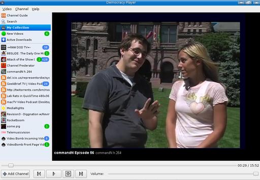 Here's how it works. The program lets you find, download, record, manage and watch Internet television programs. Those of you who have a TiVo at home will understand the beauty of this concept. By default, downloaded videos are saved for five days, at which point they are automatically deleted. If you want to save them permanently, you do have that option. Democracy also plays in full screen, so you can take advantage of that 21-inch flat-panel screen in front of you. With an integrated channel guide, a community-based rating system and associated publishing tools (so you can get in on the action), there's a lot more to Democracy than just watching TV. Because you'll more than likely start out watching content, I'll tell you all about that in a moment. First, though, I think François has returned. Please, mon ami, make sure everyone's glass has been filled.