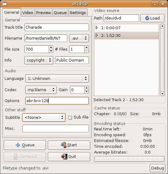 Now that we've selected the track to encode, we need to set a few options. First, under the General tab, put in the track title. This will end up being the filename for the resulting .avi file. In the Filename field, put in the path to where you want to save the file, ending with %T (the default save location is your home directory), but you can set it to wherever you want. We will get to the file size and number of files boxes later.