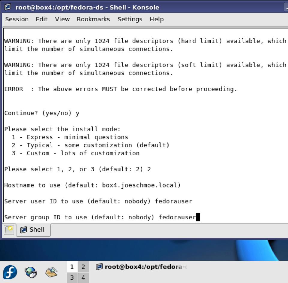 Now, with the useradd command, create an account named fedorauser under which FDS will run. After creating the account, run /opt/fedora-ds/setup/setup to launch the FDS installation script. Before continuing, you may be presented with several error messages about non-optimal configuration issues, but in most cases, you can answer yes to get past them and start the setup process. Once started, select the default Install Mode 2 - Typical. Accept all defaults during installation except for the Server and Group IDs, for which we are using the fedorauser account (Figure 1), and if you want to customize the ports as we have here, set those to the correct numbers (3891/3892). You also may want to use the same passwords for both the configuration Admin and Directory Manager accounts created during setup.
