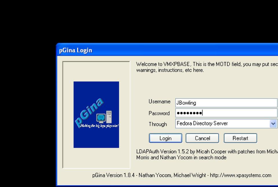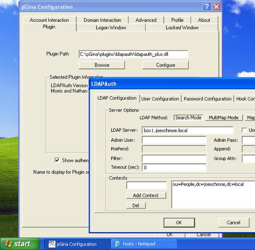 Connecting XP clients is almost as easy. Typically, NT/2000/XP users are forced to use the built-in MSGINA.dll to authenticate to Microsoft networks only. In the past, vendors such as Novell have used their own proprietary clients to work around this, but now the open-source pgina client has solved this problem. To connect 2000/XP clients, download the main pgina zipfile from the project page on SourceForge, and extract the files. For this article, I used version 1.8.4 as I ran into some dll issues with version 1.8.8. You also need to download and extract the Plugin bundle. Run the x86 installer from the extracted files, accepting all default options, but do not start the Configuration Tool at the end. Next, install the LDAPAuth plugin from the extracted Plugin bundle. When done installing, open the Configuration Tool under the Pgina Program Group under the Start menu. On the Plugin tab, browse to your ldapauth_plus.dll in the directory specified during the install. Check off the option to Show authentication method selection box. This gives you the option of logging locally if you run into problems. Without this, the only way to bypass the pgina client is through Safe Mode. Now, click on the Configure button, and enter the LDAP server name, port and context you want pgina to use to search for clients. I suggest using the Search Mode as your LDAP method as it will search the entire directory if it cannot find your user ID. Click OK twice to save your settings. Use the Plugin Tester tool before rebooting to load your client and test connectivity (Figure 10). On the next login, the user will receive the prompt shown in Figure 11.