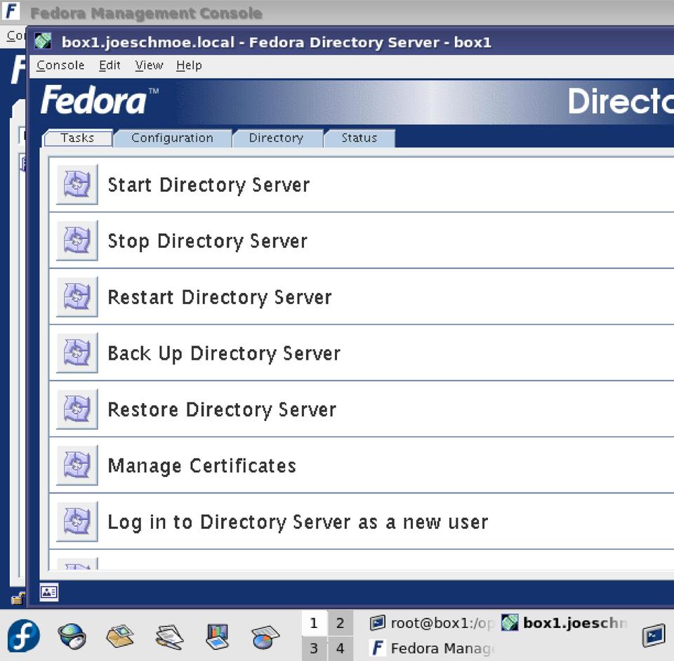 Looking at the Administration console, you will see server information on the Default tab (Figure 2) and a search utility on the second tab. On the Servers and Applications tab, expand your server name to display the two server consoles that are accessible: the Administration Server and the Directory Server. Double-click the Directory Server icon, and you are taken to the Tasks tab of the Directory Server (Figure 3). From here, you can start and stop directory services, manage certificates, import/export directory databases and back up your server. The backup feature is one of the highlights of the FDS console. It lets you back up any directory database on your server without any knowledge of the CLI. The only caveat is that you still need to use the CLI to schedule backups.