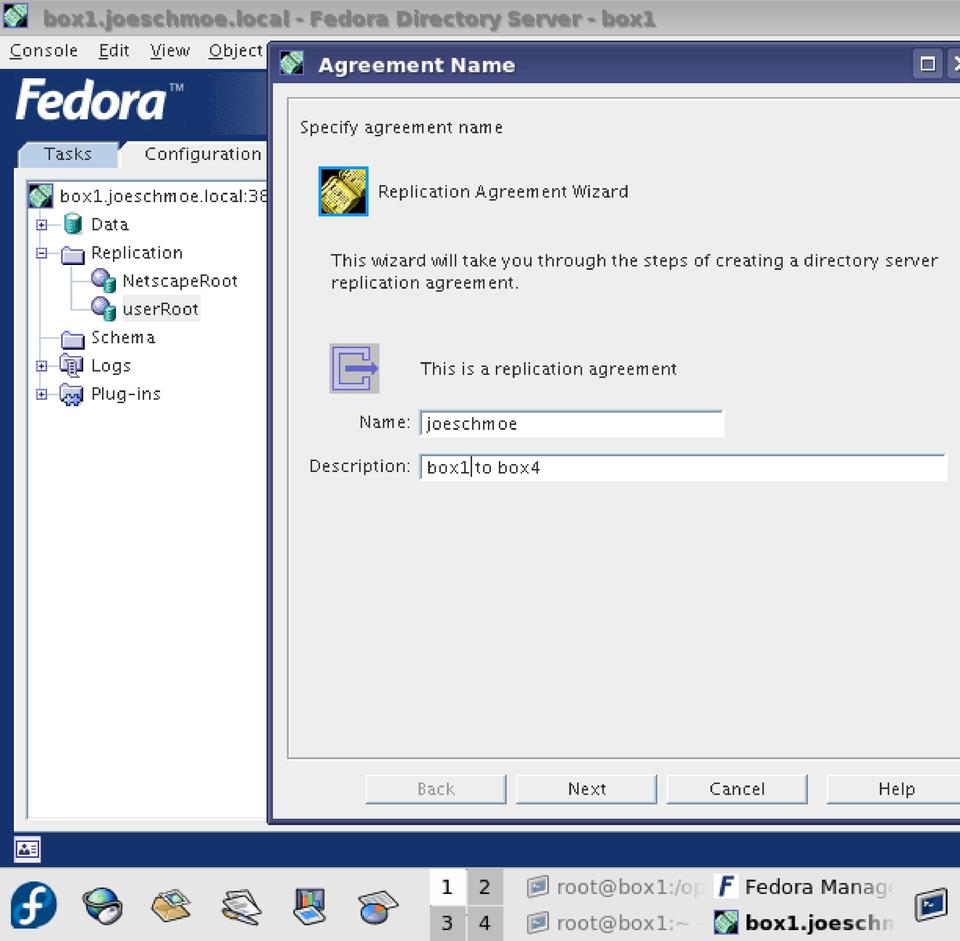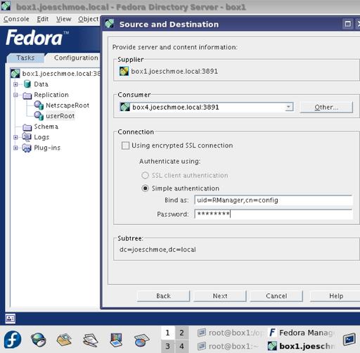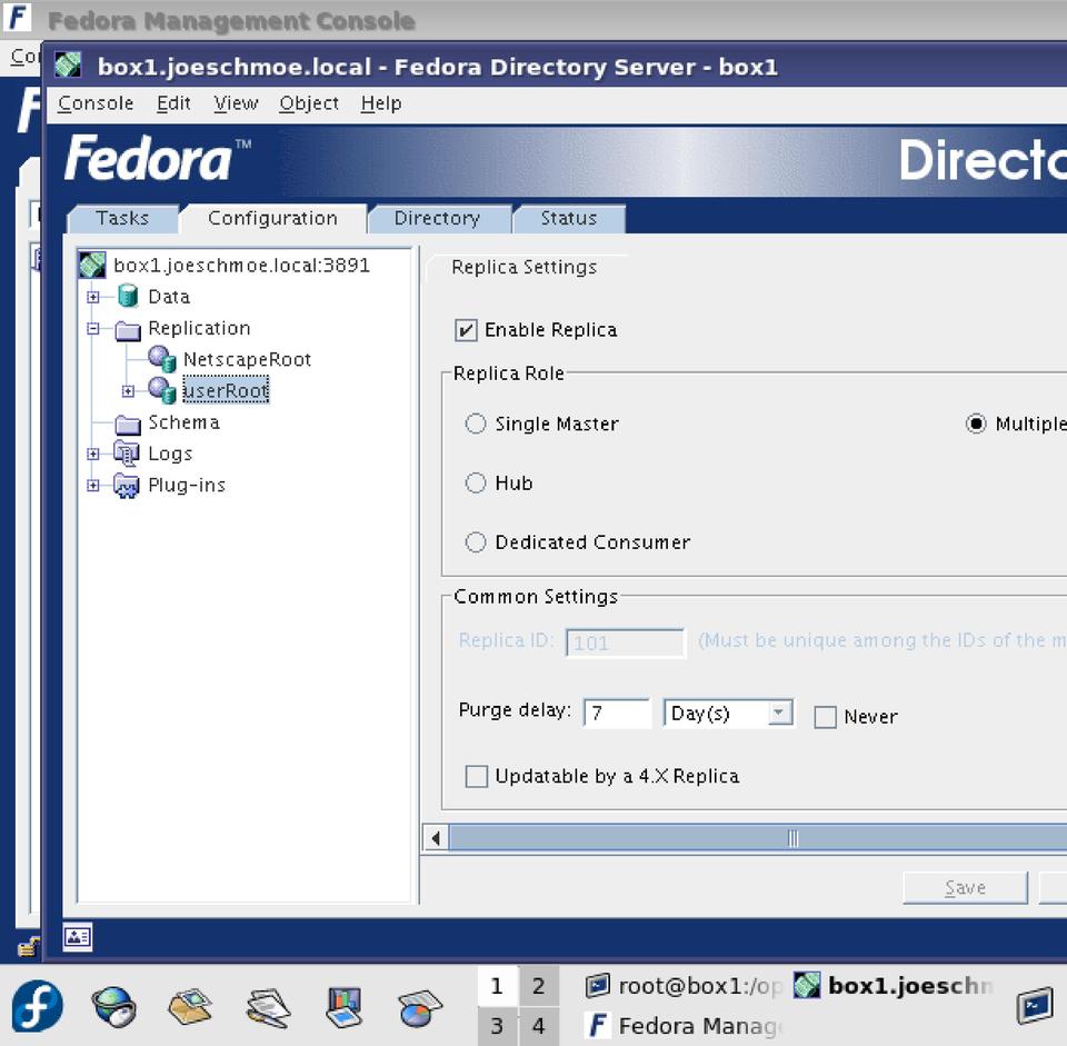 Setting up replication in FDS is a relatively painless process. In our scenario, we configure two-way multi-master replication, but Red Hat supports up to four-way. Because we already have one server (server one) in operation, we need another system (server two) configured the same way (Fedora, FDS) with which to replicate. Use the same settings used on server one (other than hostname) to install and configure Fedora 6/FDS. With both servers up, verify time synchronization and name resolution between them. The servers must have synced time or be relatively close in their offset, and they must be able to resolve the other's hostname for replication to work. You can use IP addresses, configure /etc/hosts or use DNS. I recommend having DNS and NTP in place already to make life easier.