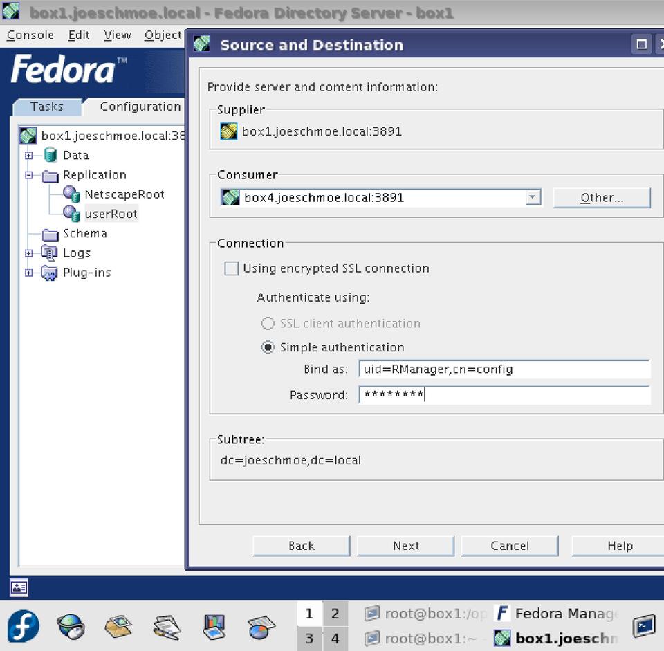 Now, you need to set up a replication agreement back on server one. From the Configuration tab of the Directory Server, right-click the userroot database, and select New Replication Agreement. A wizard then guides you through the process. Enter a name and description for the agreement (Figure 7). On the Source and Destination screen under Consumer, click the Other button to add server two as a consumer. You must use the FQDN and the correct port (3891 in our case). Use Simple Authentication in the Connection box, and enter the full context (uid=Rmanager,cn=config) of the RManager account and the password for the account (Figure 8). On the next screen, check off the box to enable Fractional Replication to send only deltas rather than the entire directory database when changes occur, which is very useful over WAN connections. On the Schedule screen, select Always keep directories in sync to keep. You also could choose to schedule your updates. On the Initialize Consumer screen, use the Initialize Now option. If you experience any difficulty in initializing a consumer (server two), you can use the Create consumer initialization file option and copy the resulting ldif folder to server two and import and initialize it from the Directory Server Tasks pane. When you click next, you will see the replication taking place. A summary appears at the end of the process. To verify replication took place, check the Replication and Error logs on the first server for success messages. To complete MMR, set up a replication agreement on the server, listing server one as the consumer, but do not initialize at the end of the wizard. Doing so would overwrite the directory on server one with the directory on server two. With our setup complete, we now have a redundant authentication infrastructure in place, and if we choose, we can add another two Read-Write replicas/Masters.