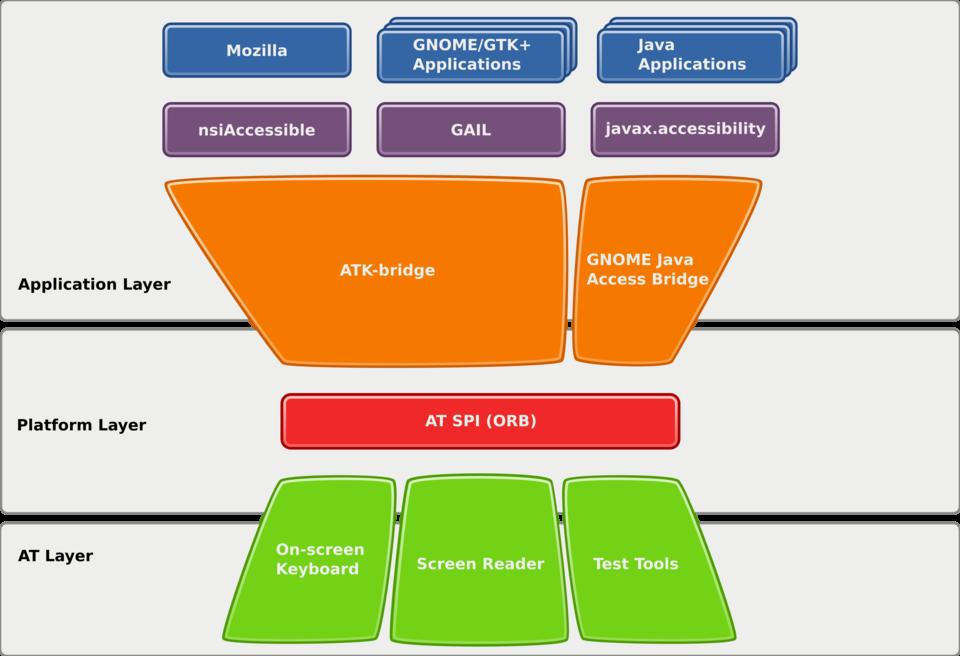 After you have asked yourself all of the above questions and provided satisfactory answers, it's time to see whether your application provides the proper instrumentation to assistive technologies, such as Orca. The functionality and state of your application are provided to the assistive technology through a CORBA-based framework called AT-SPI (Assistive Technology Service Provider Interface). From your application's side, the communication with assistive technologies is done with a library called ATK (Accessibility Toolkit), which allows you to create Accessible objects that are synonymous with your graphical widgets.
