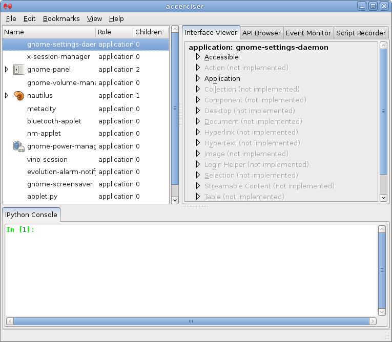 Accerciser gives a top-down view of what your application is providing regarding assistive technologies. It does this by tapping in to the same interface that an assistive technology would use, AT-SPI. Accerciser fits the needs of many different audiences. It is a tool used by assistive technology developers to see what AT-SPI is providing their applications, and it is used by automated UI test developers by exposing the different methods and events that could be expected from their target application when they author test scripts. And, in our case, it allows user interface developers to ensure that their application is providing all of its functionality through AT-SPI. In short, it allows us to exercise the accessibility of our application.