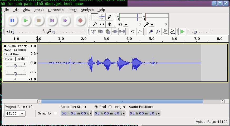After I clicked OK to accept my changes, I clicked the big red Record button on the main Audacity window and started talking. I was able to see my voice in the output immediately, and once I clicked the Stop button and played it back, I definitely was able to hear myself.