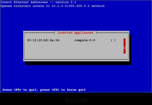 Now it's time to boot the first compute node. If you have wiped the disk, most systems will start a PXE boot from the network as a default action. If you have a KVM switch and can watch the console on the compute node, you should see the PXE boot begin. When the compute node asks for an address for eth0, you will see the MAC address entered in the Inserted Appliances list on the head node (Figure 20).