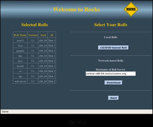 First, you need to get a copy of the Rocks package that will be appropriate for your cluster's hardware. Navigate to the Rocks Web site, and select the Download tab at the top of the home page to access the various versions of the package. The 5.1 version is the latest at the time of this writing. Click the link to get a listing of the components of the package. For this exercise, I selected the x86-64 Jumbo DVD image, downloaded it and burned it onto an empty DVD. While you are at the site, download the documentation. If nothing else, it will give you something to read while the software loads.