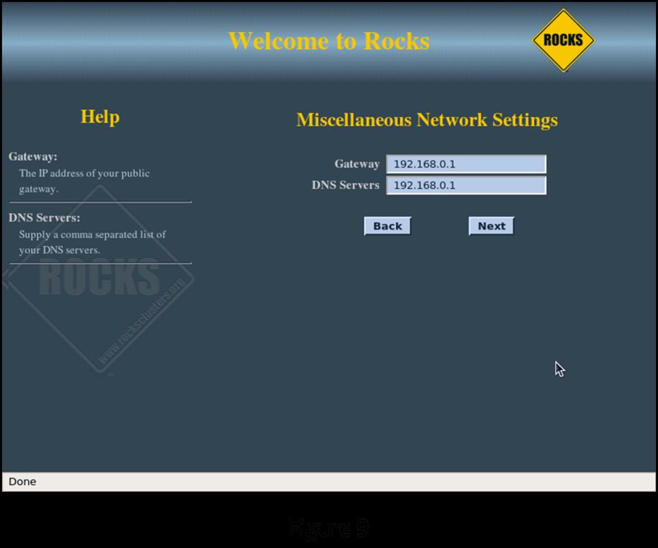Figure 8 shows configuring the “public” connection of the head node, its connection to the rest of your systems. The public connection for the head node must be configured with a fixed IP address. The public network for this example is configured as 192.168.0.X with a netmask of 255.255.255.0. Make sure the head node does not conflict with other servers and workstations on the public network. On the following screen (Figure 9), configure the local Gateway and DNS Server IP addresses for the head node to use.