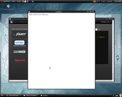 Congratulations! You just launched your first Titanium application via the Sandbox. Titanium Developer takes the snippet of code and launches a Titanium app using that code. On the side of the text area for the snippets, there are buttons for popular JavaScript frameworks. You can click one of those to add them to your sandbox application for testing instead of having to include them yourself.