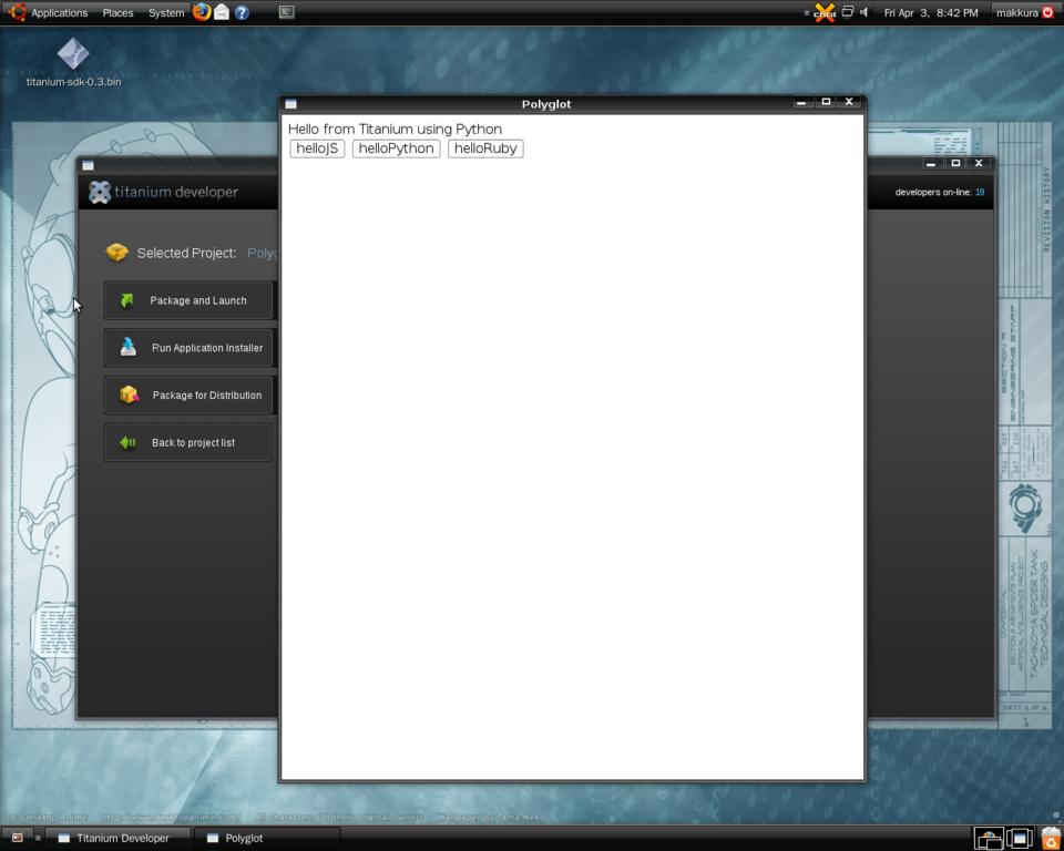 Although I mainly program with JavaScript for Web applications, it isn't the only technology that powers the Web. Titanium works well with Python, PHP, Ruby, Java, Flash and Flex, and Silverlight. So whatever technology you're using right now to develop your Web applications, you'll likely be able to use it with Titanium.