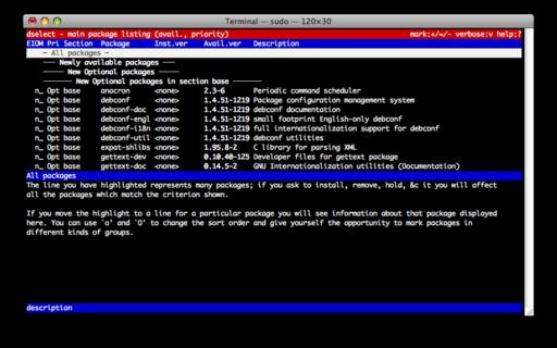 The Fink Project started in 2001 and is based on the Debian package management system, so you can use the Debian package tools like dpkg, dselect and apt-get, making it familiar for Debian-based distro users. Once the base installation is done, you can start to install packages. If you like a text-based manager, use dselect (Figure 1). If you prefer a graphical manager instead, use the following command to get synaptic (Figure 2):