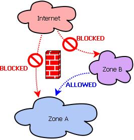 This scenario is illustrated in Figure 1, which shows a firewall that sits in between two different networks, Zone A and Zone B, and the Internet. The firewall blocks all inbound traffic from the Internet to either zone, but allows hosts in Zone B to initiate transactions with hosts in Zone A. In this case, the firewall is highly effective in making it unfeasible for Internet-based attackers to exploit the trust relationship between Zones A and B, even if the firewall filters only on source IP address.