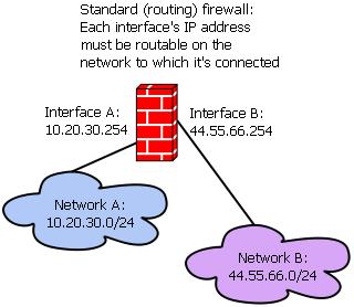 Figure 2 shows a routing firewall. As you can see, each firewall interface has its own IP address that is valid on the network to which that interface connects, and that IP address serves as the route to the other side of the firewall. In this example, hosts in Network A have to know (or send packets to some router that knows) that 10.20.30.254 is the gateway to reach Network B. Hosts in Network B have to know (or speak to a router that knows) that 44.55.66.254 is the gateway to reach Network A.