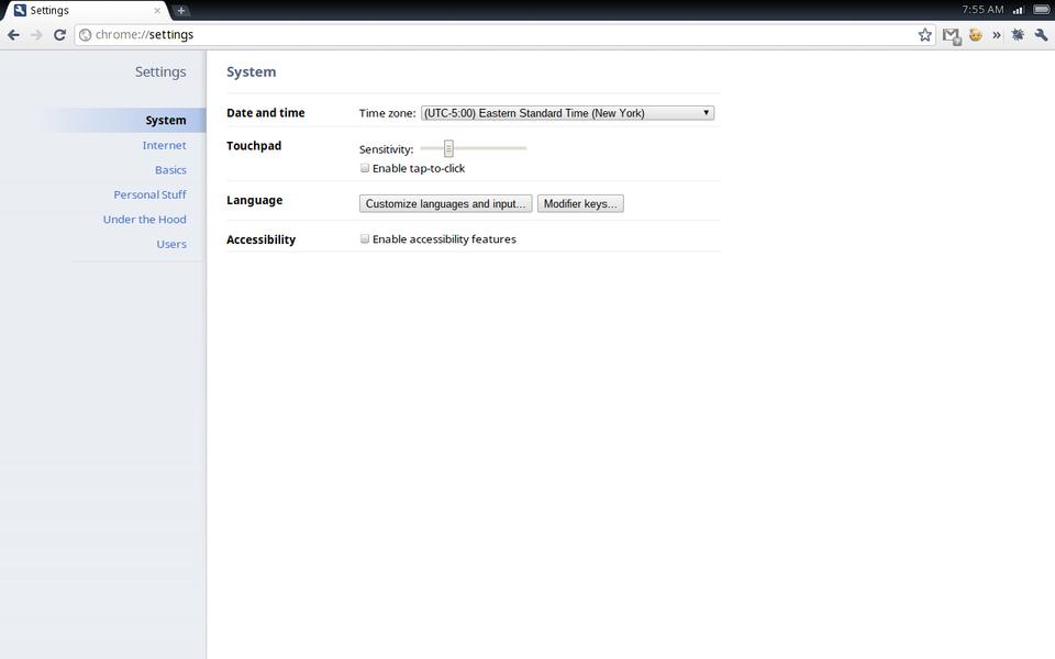 Chrome OS itself is not surprising, at least if you're familiar with the Chrome Web browser. There are a few extra configuration options, like setting the trackpad sensitivity, and network settings. But, the amount of customization you can do is minimal. An example of this minimization is with user accounts—there aren't any, at least in the traditional sense. You actually are running as the “chronos” user, but you never log in as that user. Instead, you log in using your Google account credentials.