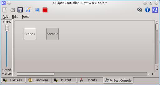 As I'm running out of space, let's jump to the Virtual Console, where I guess you could say the live direction happens. The basic idea is that you place a button somewhere in the workspace and then link it to something like a scene, effect or chaser. This way, you can have a series of labeled buttons, so if you're lighting a stage play, for example, you can click a button to have specific lighting for one scene and then click another button to change the lighting for the next.