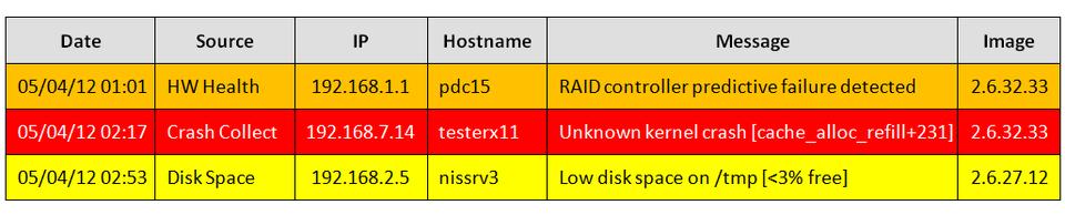 Kernel crash monitoring module—this Perl-based component reads crash data from the database and generates alerts for machines, machine models and crash reasons that exceed environment normalcy thresholds in given time periods. We use the module to detect site-wide issues that may not be immediately apparent from single crashes. The monitor can send e-mails or display alerts to a 24/7 manned Web console. Figure 1 shows a mockup view of the monitoring console output.