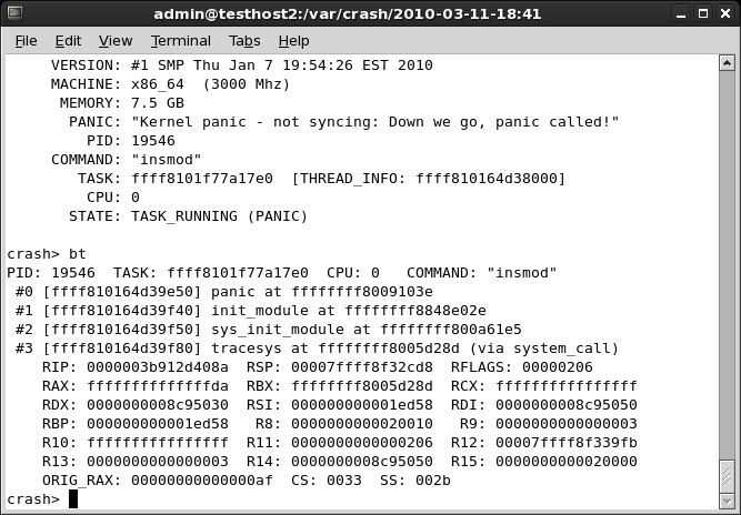 Crash data consists of the entire memory core dumped at the time of the crash, kept in a file named vmcore. We analyze the memory core using the crash utility. To automate the procedure, we invoke the crash utility in an unattended manner using an input file with line-delimited crash commands. An interactive view of the crash utility running in a terminal window is shown in Figure 4.