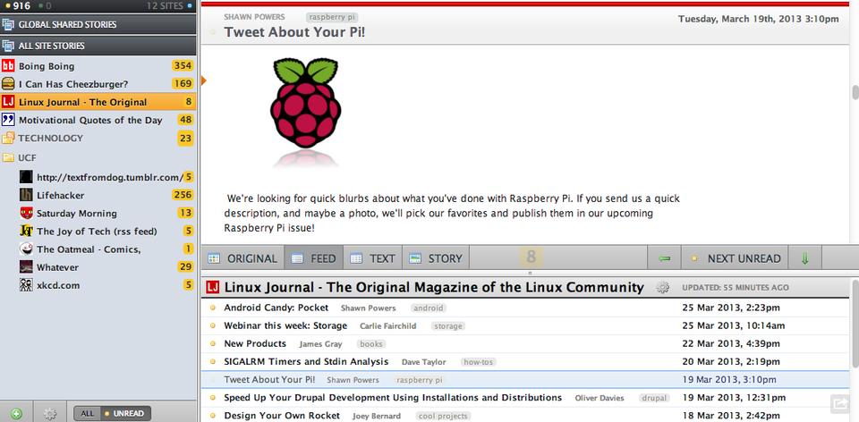 NewsBlur is an interesting contender for “Google Reader Replacement”. It is a fully open-source program, but the service provided from www.newsblur.com offers a very restricted “free” offering. I want to like NewsBlur, especially based on its open nature, but the free offering is so limited (it limits the number of feeds you can add), it's hard to test it long enough to justify the subscription fee. Like Feedly, NewsBlur offers a more “exciting” interface for browsing your feed (Figure 4). If you prefer that sort of look, NewsBlur is worth checking out. The open-source reality of NewsBlur brings me to the next and final section.