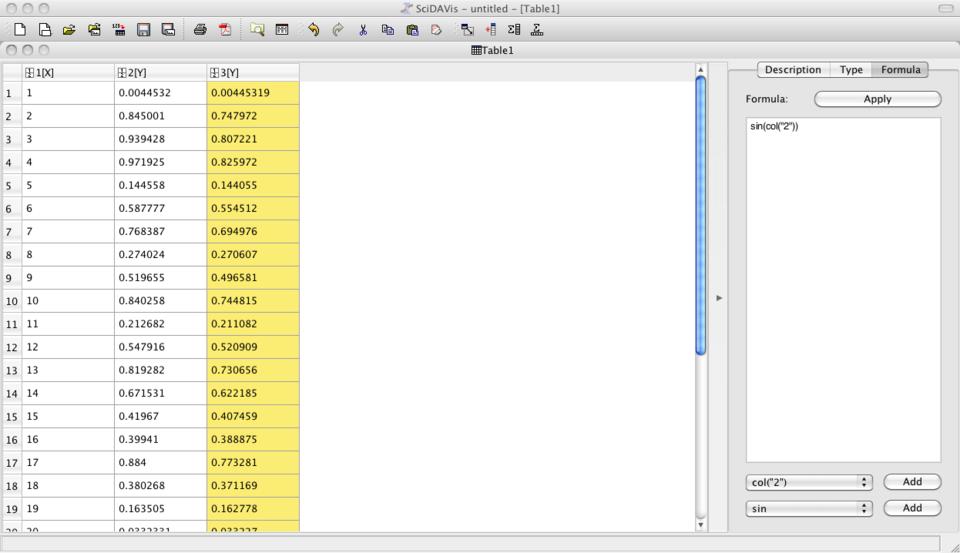 When you are first learning to use SciDAVis, you probably will just want some junk data to play with. You can do this easily by right-clicking the columns and selecting “Fill Selection with”. Then, you can fill the column with either row numbers or random numbers. Once you have some data available, you can create new columns that are functions of the values stored in the other columns. To access this functionality, you need to select the formula tab in the right-hand side pane. In order to explore some of the other features, let's set the first column to be the row numbers and the second column to be a set of random numbers (Figure 2).