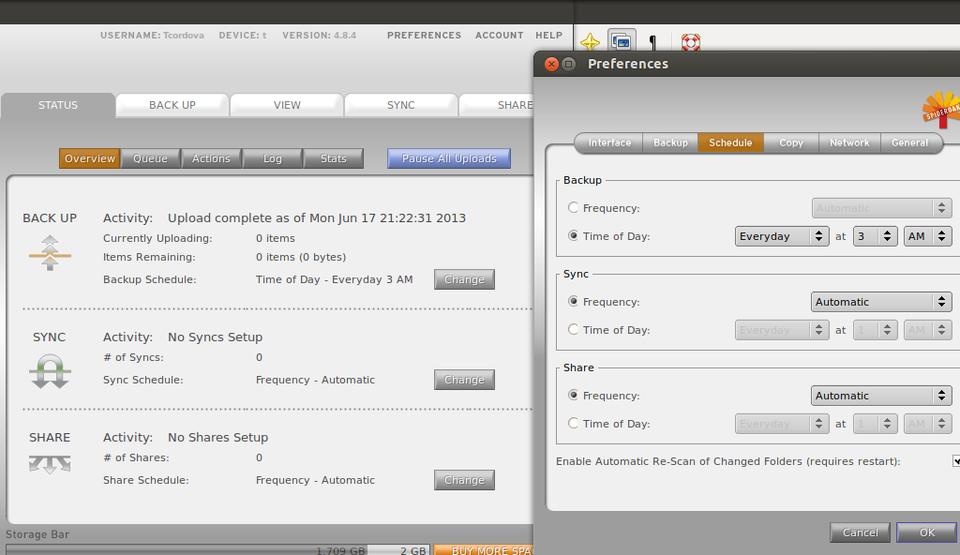 Figure 11. A SpiderOak application status and backup menu provides a means to back up your encrypted volume automatically in specified intervals.
