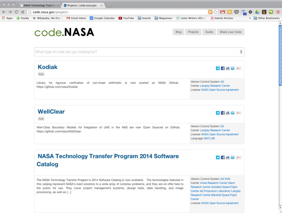 One issue that will become evident right away is that not everyone can access all of the available software. Some of the released software is available only to US residents, and some is even more restricted to only parts of the US government. So, is there an easier option for the international community? On the front page, there is a set of other useful NASA links on the lower-left side. The one labeled NASA Open Source Software (code.nasa.gov) will take you to a sister site that provides access to a more centralized repository of software released as open source. It is laid out as a list of available code within a WordPress blog, and it looks like it's being updated regularly. So, it's worth keeping an eye on this site for future releases.