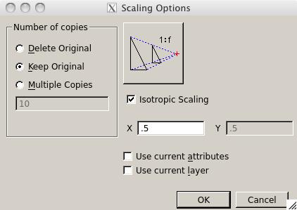 Using these tools, however, isn't very intuitive. Say you want to scale an element of your drawing. The first thing you will want to do is to click on the Modify→Scale menu item. You next will notice that the command-line box at the bottom of the window has changed, asking you to “Select to scale”. You then need to click on the element you want to scale, say a line element, and press the Enter key. The command-line window then will change to saying “Specify reference point”. LibreCAD scales based on a reference point to act as a point of perspective, so go ahead and click on a point. This will pop up an option window where you can set things like the scaling factor and whether it is isotropic (Figure 6). When you click OK, LibreCAD will apply the modification and refresh the drawing.