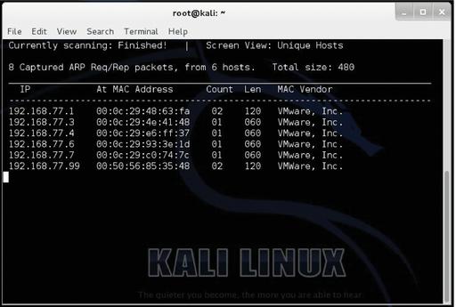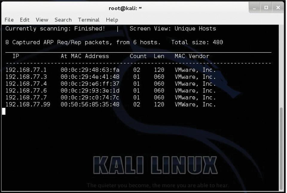 To get started, let's generate a listing of the devices on the network. There are multiple tools to do this, but the easiest to get going is netdiscover. Launch your Kali workstation and click on the Applications menu, then Kali Linux→Information Gathering→Network Scanners→netdiscover. This will launch a terminal prompt. Type netdiscover -r YOURIPSEGMENT/SUBNET (for example, 192.168.77.0/24) to scan the local subnet (Figure 1).
