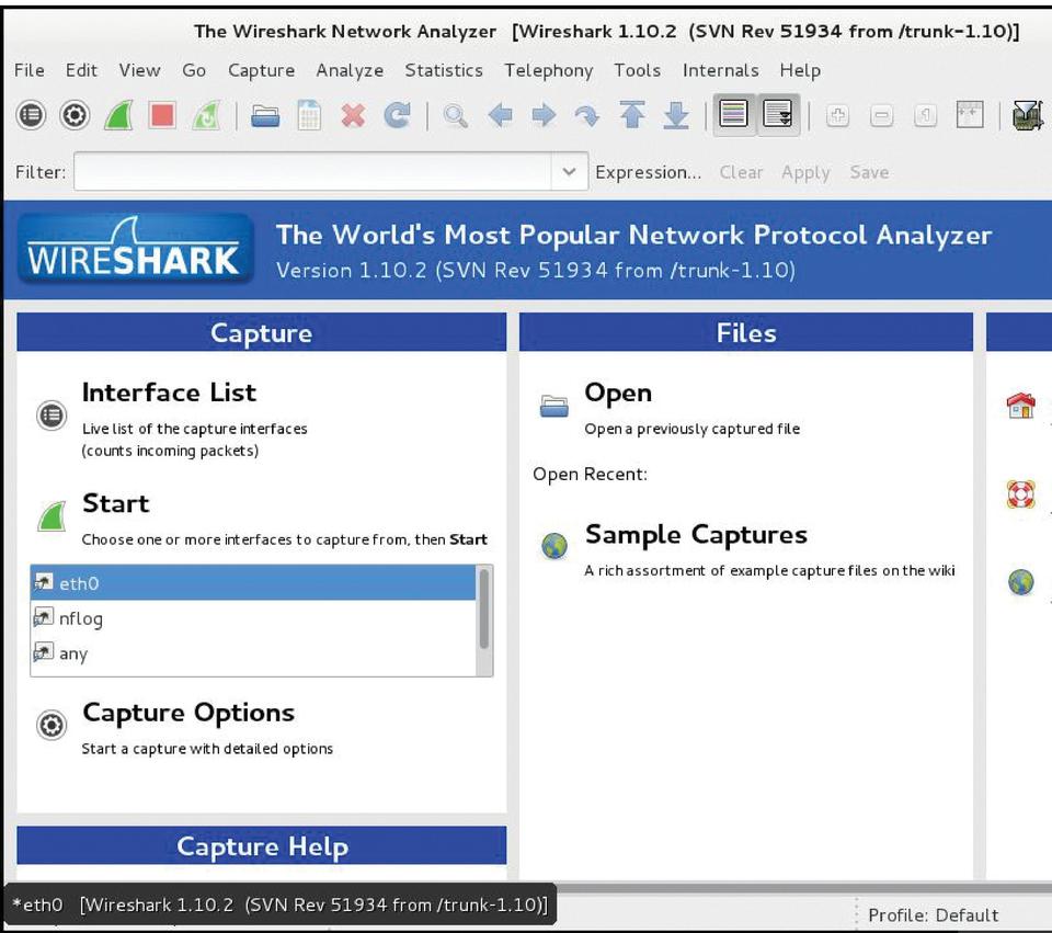 In Kali, click on Applications→Kali Linux→Sniffing/Spoofing→Network Sniffers→Wireshark. Wireshark will start with its basic screen (Figure 2). Select the interface you want to listen on and click Start. The default setting on Kali is set to promiscuous mode, but you may need to do further configuration if you want a more thorough capture. Allow the capture to run for as long as you deem necessary. This may depend on the size of your subnet, bandwidth and storage. My rule of thumb is to take samples of 5–10 minutes at peak times (morning, middle of the day).