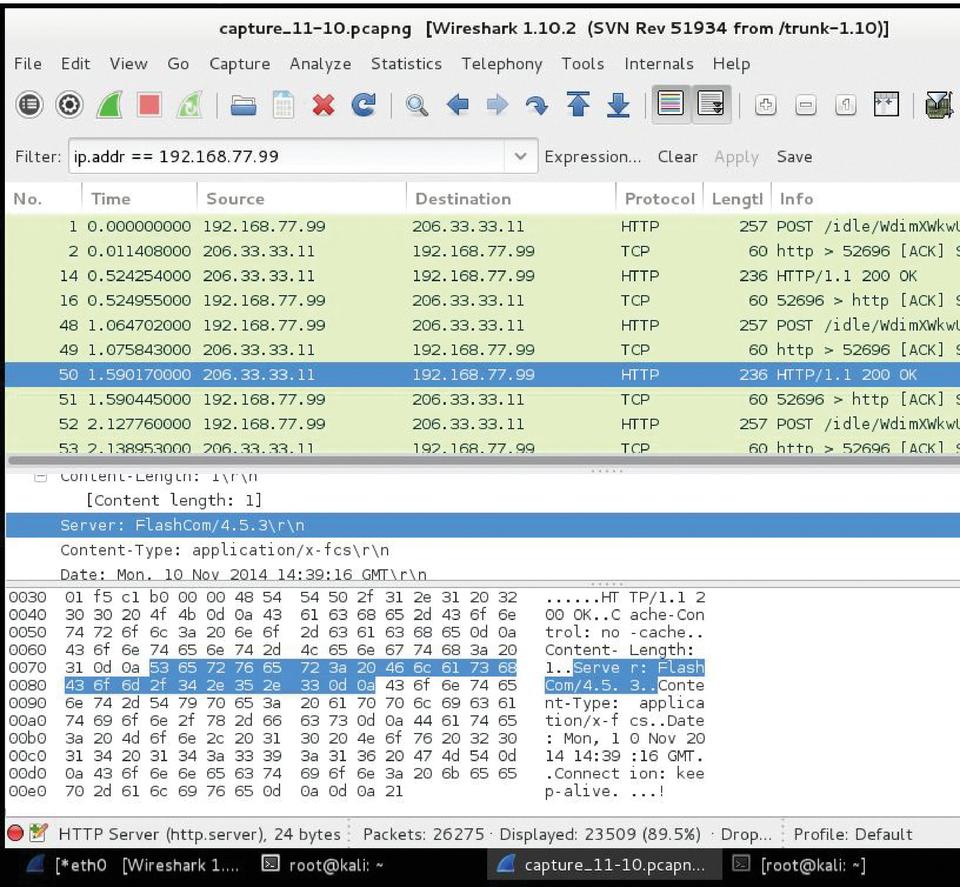 Review your captures and look for items of big concern. Are there any protocols being used that you don't recognize or that are unauthorized? Are there any IPs or traffic-related behavior that look out of place? Make sure to note any unusual findings for the final report. In my test capture (Figure 3), I can see an abundance of traffic between one of my Windows clients another external host. As I inspect the packet, I see it is connecting to a Flash-based server. It turns out my test user is using a streaming service from his workstation. This could be allowed or it might not be. Either way, Flash player has plenty of vulnerabilities to exploit. As you review the captures, note any exceptions to normal or expected traffic.