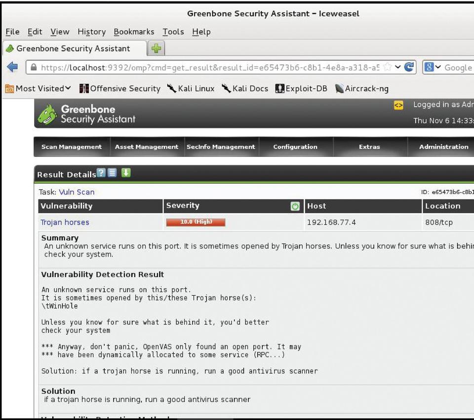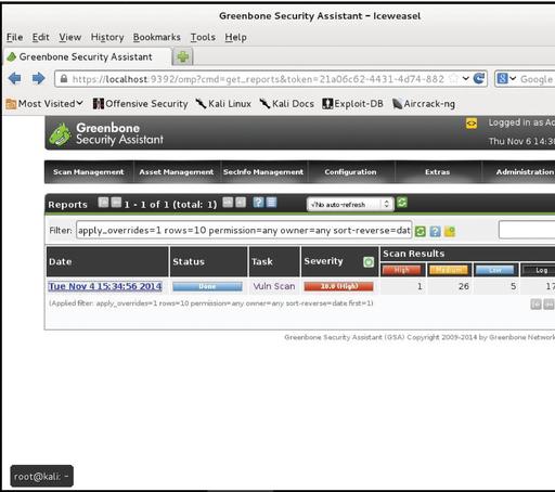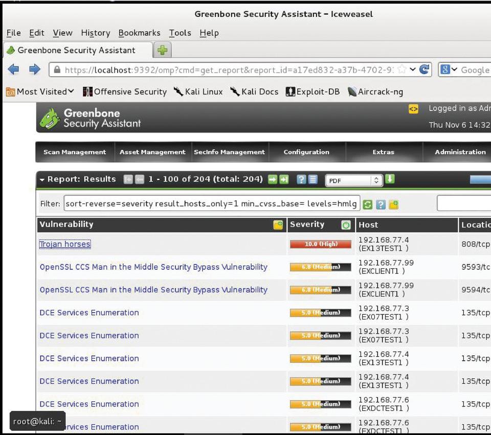 After the install is complete, come back to the same section and select “openvas start”. After a few seconds, load a browser and navigate to https://yourkailipaddress:932. Log in with the admin account and the password you recorded during set up. Ignore the welcome screen, as you will save time by performing a bigger scan. Click on the Configuration→Targets link. On the Targets page, click on the white star in the menu bar to create a new target. Enter a name for the Scan and any comments. Click on the browse button to find the text file with the list of hosts generated from netdiscover. Under Port List, select “OpenVAS Default”. In the “Alive Test” drop-down, select Consider Alive. Click Save Target. Now click on the Scan Management link in the menu and then click on Tasks. On the page, click on the star in the menu again to create a new task. Give the scan a name and add any comments. In the “Scan Config” section, select “Full and fast”. Under Targets, select your target. Check the box marked yes next to “Add results to Asset Management”, and click on Create Task. This takes you back to the Task Details page. Click on the green play button in the menu bar to start the task. You can set the refresh rate of the scan status in the drop-down in the middle of the page. I set ours to 60 seconds. This scan will take a while (depending on the number of hosts scanned). When the scan is complete, OpenVAS will generate a report.