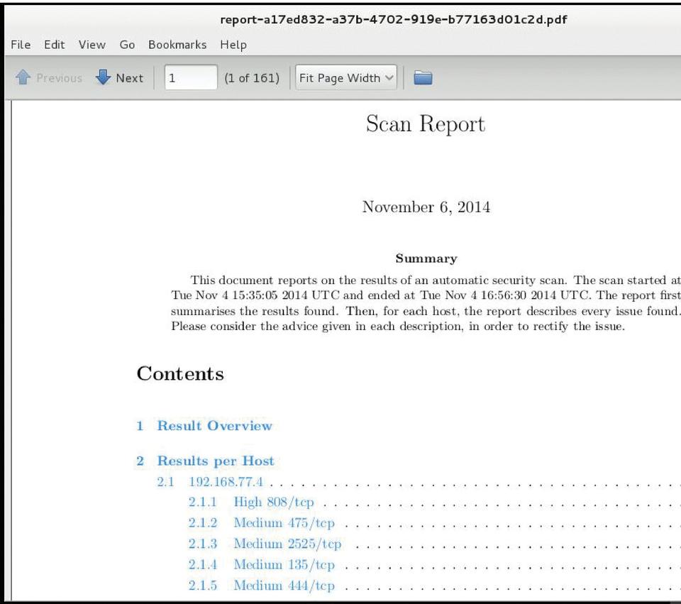 OpenVAS does a nice job of exporting formatting reports in .pdf (Figure 9). As you analyze the report, make your own determinations of risk and assign a level you feel is commensurate with the vulnerability. Use labels you feel comfortable with (High, Medium, Low and so on). You know your enterprise better than anyone, so you should feel comfortable assigning risk to any found vulnerabilities on your systems. Although “risk” is an immensely broad topic, if you don't have a lot of experience assigning it, you always can use the commonly accepted risk formula to assign levels: Risk = Threat x Vulnerability x Impact.