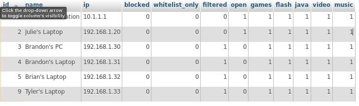 Because I don't want to write an actual interface for all of this, I simply use phpMyAdmin to update a database and set policy (Figure 1). In order to grant a particular access level, I simply update the corresponding cell in the grid, with 1 being on, and 0 being off.