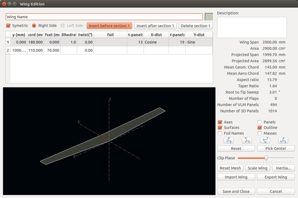 You can give it a name and description, and set all kinds of characteristics. You also can select sections of your wing and use the airfoils that you designed in the earlier step to provide the cross-sections of the wing along its length. Once you are happy, you can click on the Save and Close button and see your new wing displayed in the main window.