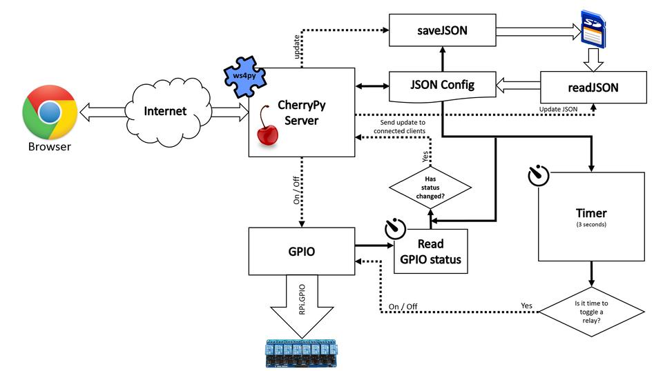 The back-end server on the Raspberry Pi needs to control the GPIO pins on the Raspberry Pi board. It also needs an HTTP interface to serve the UI and a WebSocket interface to pass command and status messages. Such a specific server did not exist for off-the-shelf deployment, so I decided to write my own using Python. Python has prebuilt modules for the Raspberry Pi GPIO, HTTP server and WebSockets. Since these modules are specialized, minimum coding was required on my part.