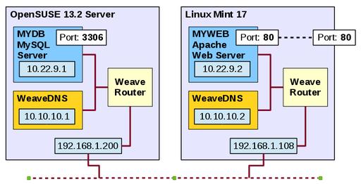 First, decide which (unused) subnet you'll use, and assign a different IP on it to each container. Then, you can weave run each container to launch it through Docker, setting up all needed network connections. However, here you'll hit a snag, which has to do with the missing step I mentioned earlier. How will containers on different hosts connect to each other? Docker's --link option works only within a host, and it won't work if you try to link to containers on other hosts. Of course, you might work with IPs, but maintenance for that setup would be a chore. The best solution is using DNS, and Weave already includes an appropriate package, WeaveDNS.