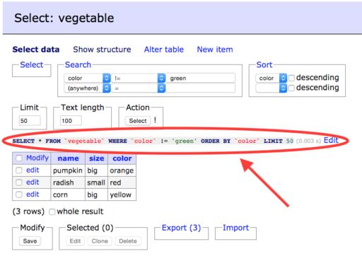 This silly little database of fruits and vegetables is obviously far more simple than the sorts of databases you'll be troubleshooting for Web applications. Thankfully, the concepts are exactly the same whether you're searching through thousands of financial transactions or a handful of produce items. It's also important to realize that just SELECT-ing records in a live database won't alter any data, so you don't have to worry about ruining things just by looking. In fact, it's really good practice to try building complex queries on existing databases just to see if you can do it correctly. If you get stumped, just fire up Adminer and see what you did wrong. Good luck, and happy databasing!