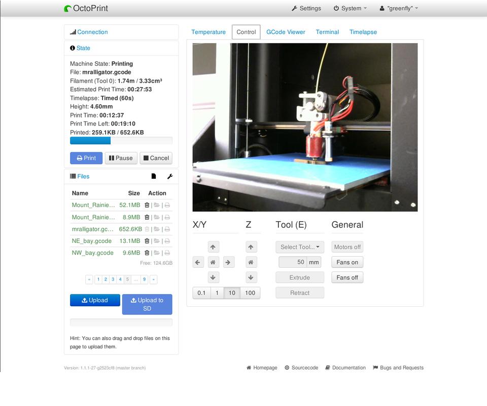 The second tab on OctoPrint provides a Web-based control panel that you can use for manual control of the X, Y and Z axes of your printer as well as extrude plastic. If OctoPrint detects a USB Webcam or the Raspberry Pi camera, it automatically will start MJPG-streamer, and you should be able to see live video from your Webcam (Figure 2). This is pretty useful when you want to start a print from some other room of the house or if you want to monitor a print in progress. If you do have a camera aimed at your printer, you also can click on the Timelapse tab and configure OctoPrint to create a time-lapse video of your print. It can either take a snapshot every few seconds or it can take a shot every time the Z axis changes (that is, when the printer moves to the next layer).