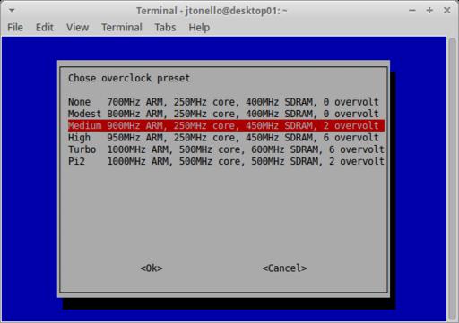 You'll be offered six overclocking options. Each offers an increasing level of speed—and heat. Although the RPi 2 Model B is rated at 900MHz, I went ahead and chose the Medium overclock preset, which offers 900MHz ARM, 250MHz core, 450MHz SDRAM and 2 overvolt (Figure 4).