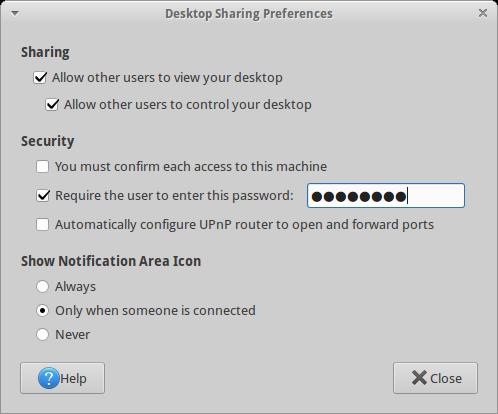 Under Sharing, enable both “Allow other users to view your desktop” and “Allow other users to control your desktop”. Uncheck “You must confirm each access to this machine”, so you don't have to acknowledge the connection on the target RPi. Also check “Require the user to enter this password”, and enter a password to thwart any unauthorized access.