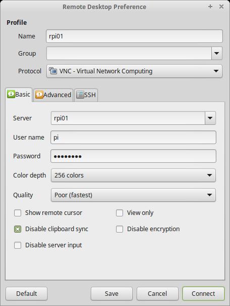 Once the RPi reboots, repeat the vino package install and setup on any additional RPis you're using, then go to your desktop and install a VNC-compatible remote-desktop client. There are many options for all platforms, but I prefer Remmina on my Linux Mint 17 desktop. Remmina supports VNC and RDP, and it makes it easy to throttle the graphical resolution and connection speeds to customize the remote-user experience.