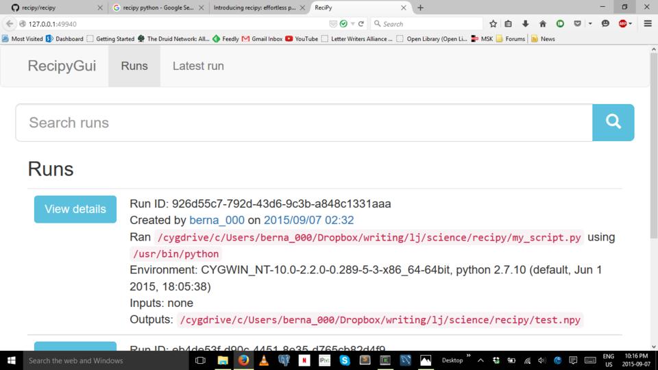 After reading this article, you never should lose track of how you reached your results. You can configure recipy to record the details you find most important and be able to redo any calculation you did in the past. Techniques for reproducible research are going to be more important in the future, so this is definitely one method to add to your toolbox. Seeing as it is only at version 0.1.0, it will be well worth following this project to see how it matures and what new functionality is added to it in the future.