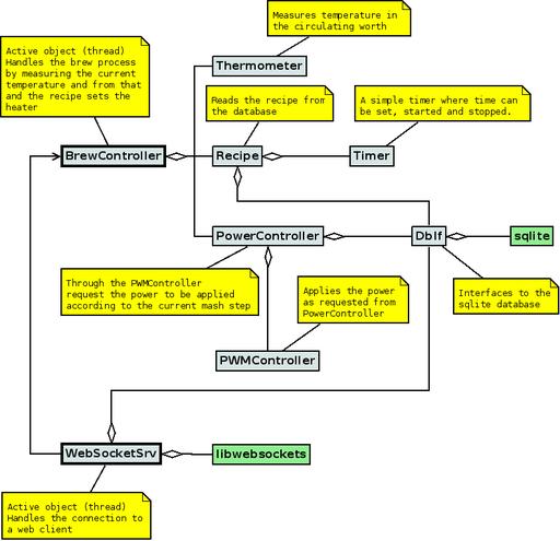 I've already mentioned the requirements, and from there, you can extract that we need a controlling functionality that will read the temperature in the mash when it leaves the bottom of the tun. Based on the temperature read, it will set the period time of the output PWM. Also, we need a database enabling us to log the collected data during the brew process. Now, a database also could archive the recipes or at least the part of the recipes that is about temperatures and time. Finally, I also mentioned having a Web page. Data comes from the database, but how do we serve the data to the Web page? Because I also wanted to show the state of the controller on the Web page, I embedded a Websocket server into the application. This led (after a few iterations) to the software architecture diagram shown in Figure 2. Add to the architecture diagram a Web client program—for example, Firefox that loads and executes the JavaScript code embedded in the Web page. However, the database and Web page are beyond the scope of this article; I may cover them in a future article.