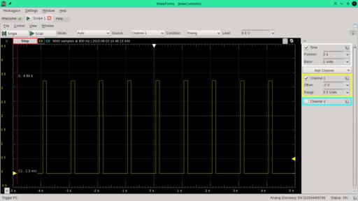 As I mentioned earlier, a way of controlling the amount of power supplied to the heater is to use a PWM signal to control a relay. If you turn it on for one-third of the time and off for two-thirds, the applied heat is only one-third of the usual amount of heat when running switched on all the time. This can prevent having particles in the brew burn onto the heater. See Figure 3 for an example PWM signal output. Here I have set the period time to be approximately one second and the “on” time to be approximately 20% of the period time.